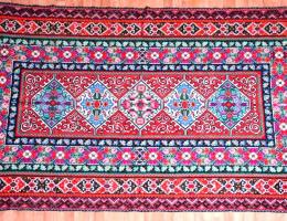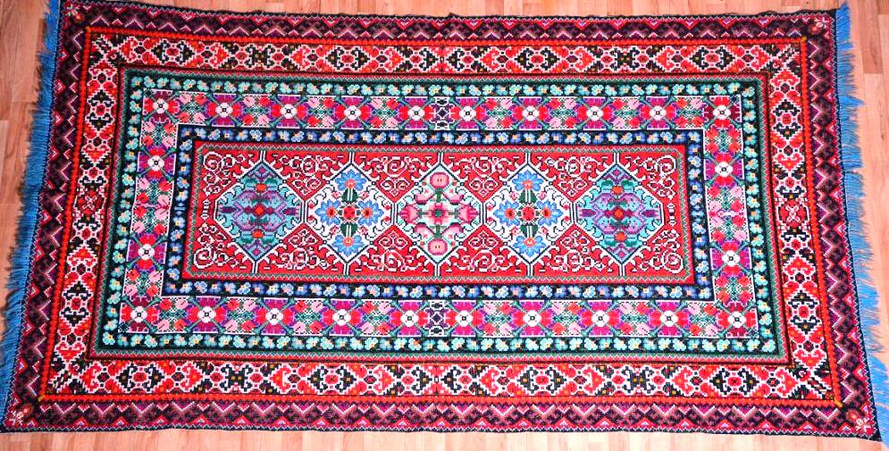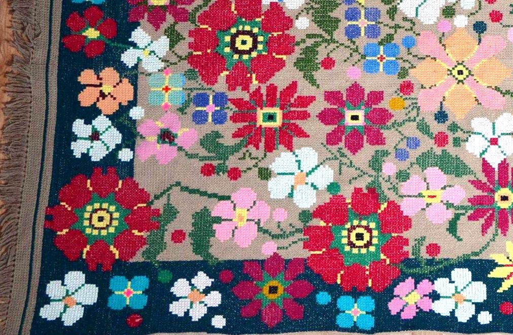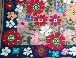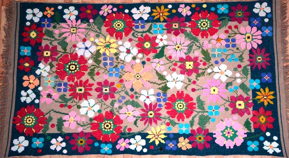 Ковер «Цветочная полянка» вышит также сложным крестом. Яркие цветы различной формы представлены на этом ковре. От торжественных маков и пионов до нежных незабудок и пахучей календулы. Это замечательный пример мастерства вышивальщицы, которая очень любит природу и часто использует цветочные мотивы в своем творчестве.