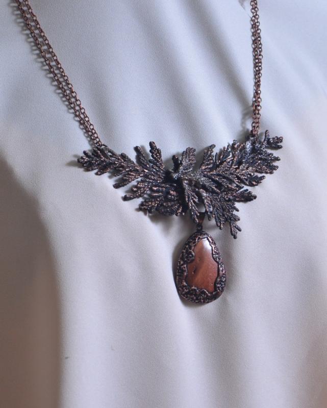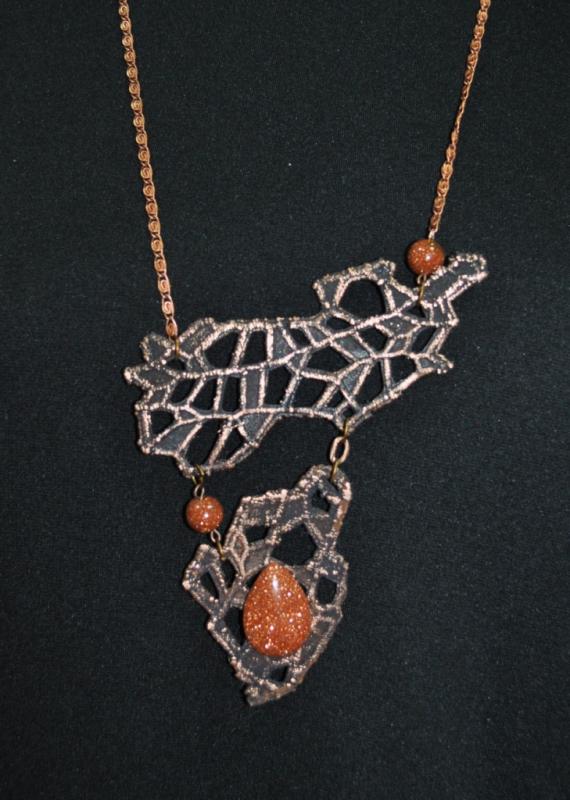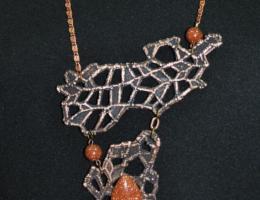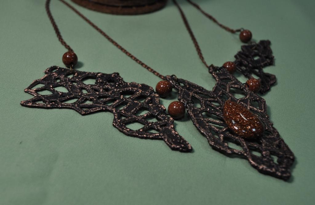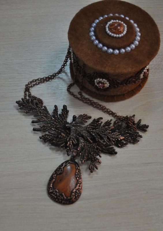 Гривна «Вересковый мед» и кулон «Вересковый мед». Гривна выполнена в технике гальваники, с обжигом, патинированием и шлифовкой. Состоит из трех частей, соединенных между собой бусинами. Материалы гривны: омедненные фрагменты бумаги для цветочных букетов, кабошон и бусины авантюрина, металлическая фурнитура. Название необычное. Авантюрин напоминает капли меда, а вереск - это символ бессмертия и молодости. Все понятия красиво объединились в названии «Вересковый мед».