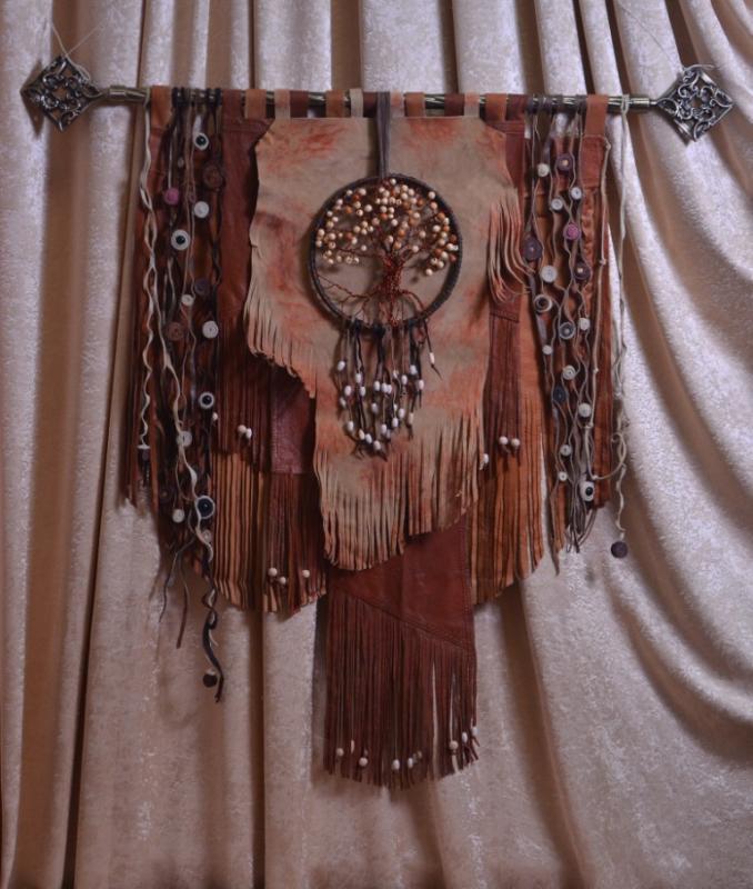Панно «Древо жизни. Самарская Лука». Декоративное панно из кожи, с использованием стекла, бусин, металлической фурнитуры. В центре композиции дерево как символ всего живого на земле, как символ начала жизни в нашем Самарском крае, на Самарской Луке. Бахрома из кожи и волнообразные кожаные полоски символизируют ручейки и речушки, которые орошают нашу самарскую землю и впадают в Волгу-матушку. Теплая охристо-рыже-коричневая гамма панно символизирует душевное тепло, исходящее от родной природы и добрых сердец жителей нашего края.