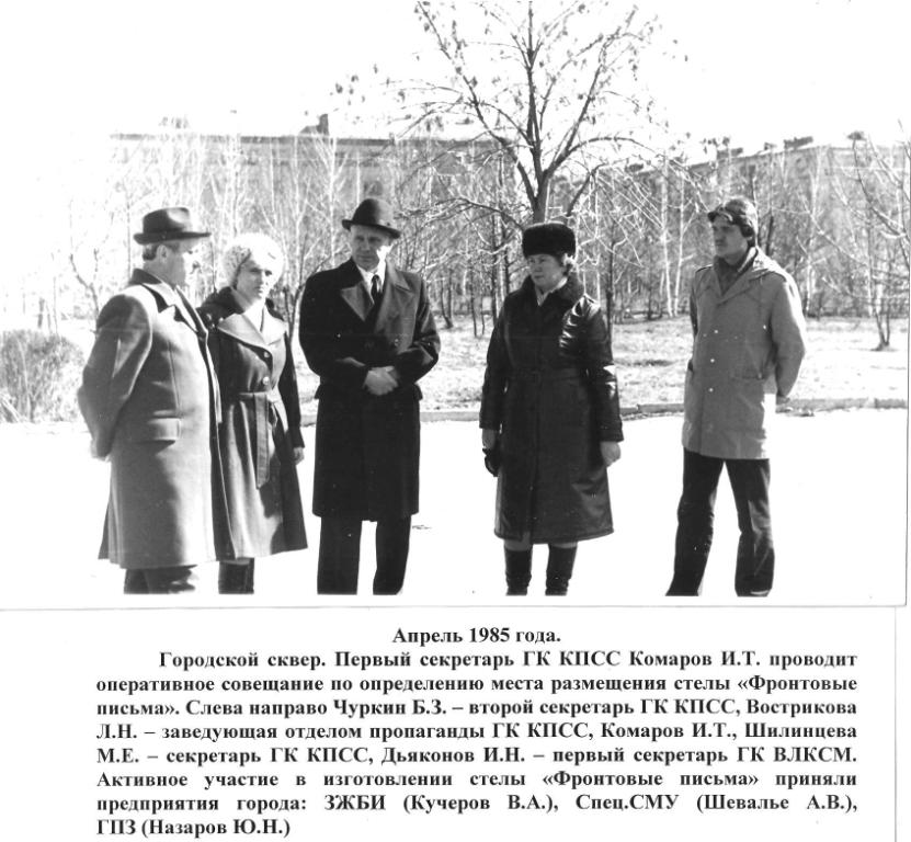 8 мая 1985 года в честь 40-летия Великой Победы в городском сквере состоялся митинг, посвященный открытию стелы «Фронтовые письма». Слово предоставили председателю городского исполнительного комитета Борису Ивановичу Говорухину. Затем речь произнес первый секретарь ГК КПСС Иван Тимофеевич Комаров: «Сегодня мы открываем обелиск Победы, замечательное творение учителя рисования и черчения школы №8 Ураткина Павла Леонидовича».