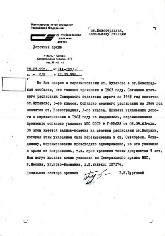 Ну, а когда же произошло переименование станции Муханово в Новоотрадную? В выписке из архива Куйбышевской железной дороги сообщается, что, согласно штатному расписанию Куйбышевского отделения дороги на 1963 год, станция носит название Муханово. А в штатном расписании на 1964 г. уже появляется станция Новоотрадная. Переименование произошло по указанию Министерства путей сообщения СССР №Г 22628 от 3.09.1963 г. Сегодня старый вокзал используется как багажное отделение, но память о той роли, которую он сыграл в основании города, сохранится навсегда.