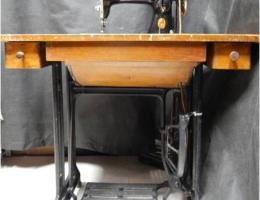 Изготовитель: Подольский механический завод им. Калинина (ПМЗ). Время создания: вторая половина XX века. Материал: металл, дерево. Швейная машинка из металла, черного цвета, приводится в действие с помощью ремня и педали, которая находится внизу стола. На крышке стола внизу по левому и правому краю сделаны ячейки для хранения, ящички выдвигаются. Машинка складывается в стол и закрывается при помощи двух дверок.