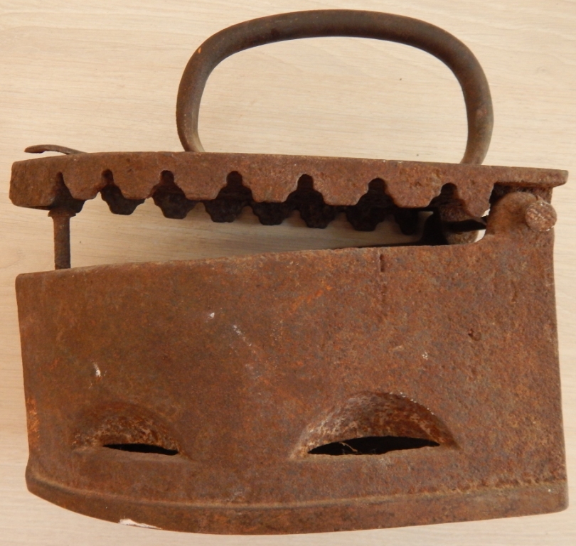 Утюг откидывается вверх, внутрь закладываются угли. К низу у основания 5 полукруглых отверстий. Верх ребристый, с зубчиками. Закрывается на защёлку – рычажок.Эти утюги были невероятно тяжелыми. Иногда для разжигания жара приходилось размахивать ими в разные стороны.