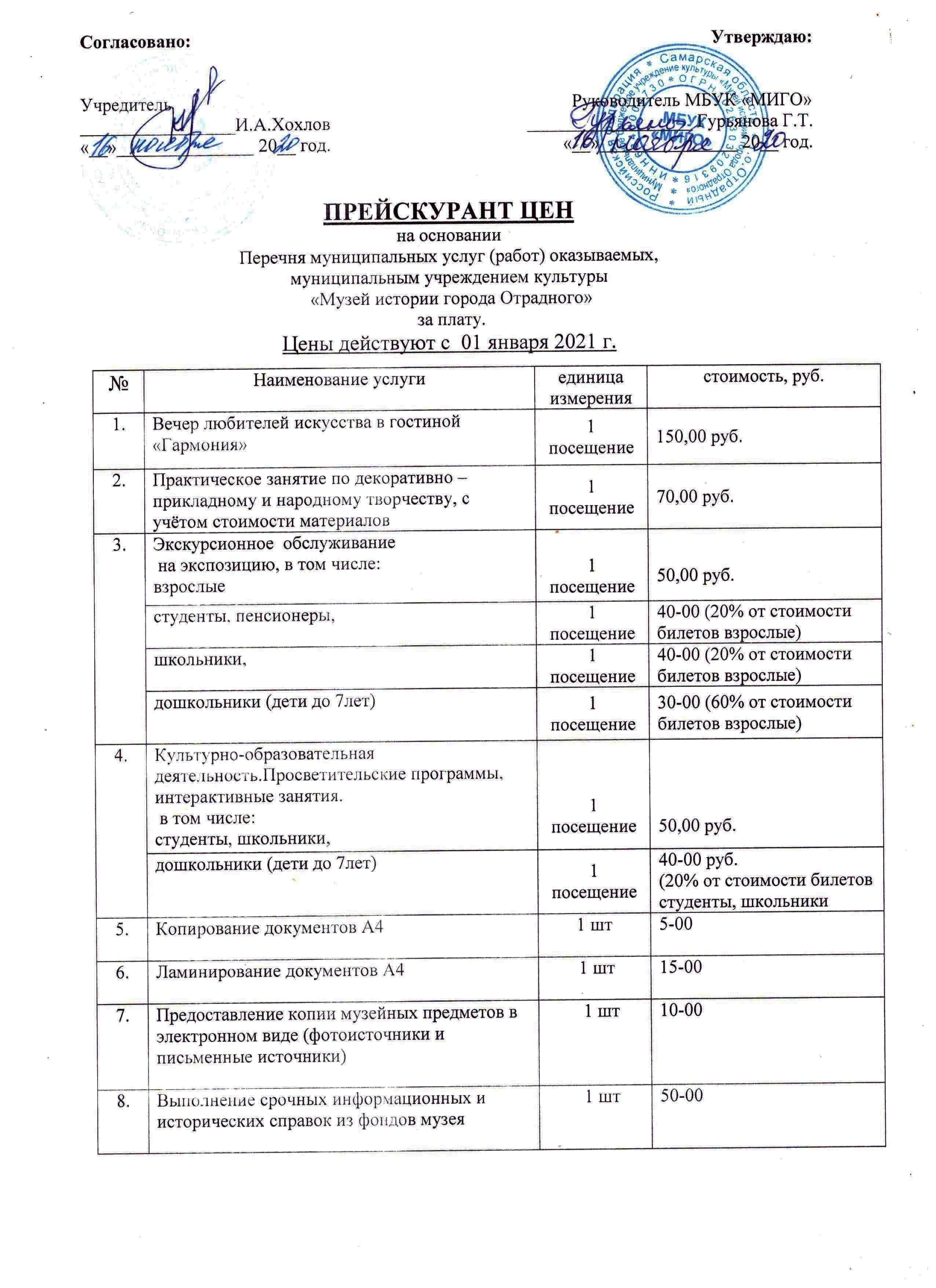 Прейскурант цен на 2021 г.