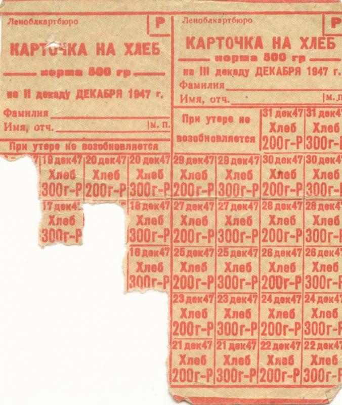 Они появились в блокадном Ленинграде уже в июле 1941 года. Это не вызвало паники среди населения, т.к. иногда хлеб по норме и не выкупался полностью. Кроме него были и другие продукты: крупы от 1 до 2 кг в месяц, мяса - от 600 до 2,2 кг мяса. Норма зависела от социального статуса. Карточная система часто предполагала замены одних продуктов на другие: вместо сахара на те же талоны можно было получить кондитерские изделия или какао, вместо масла — жир или даже селедку.