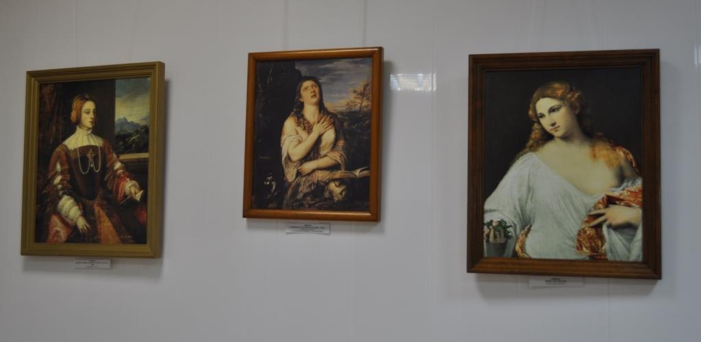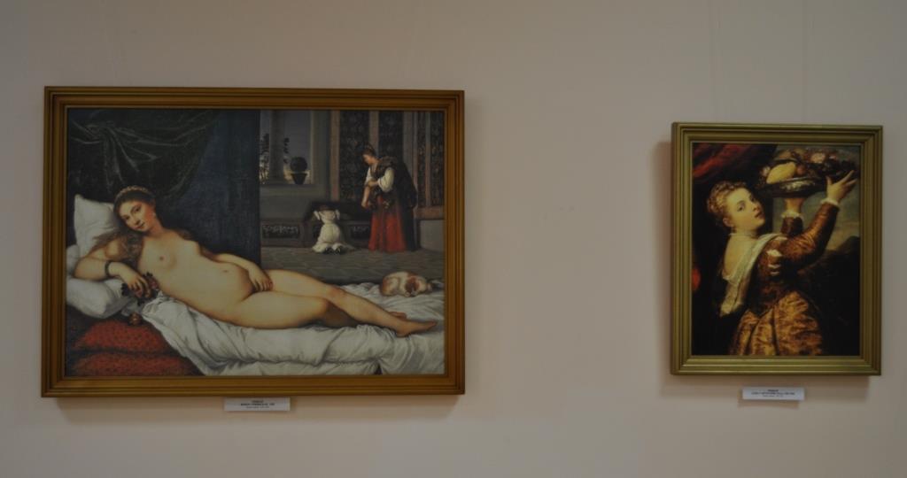 В многообразной панораме выставки нелегко выделить отдельные примеры, и все же репродукция картины Тициана «Венера Урбинская» достойна этого по праву. Картина написана по заказу герцога Урбинского. Возможно прототипом Венеры Урбинской послужила юная невеста Гвидобальдо. По другой версии моделью для картины послужила возлюбленная Тициана, высказывалось также предположение, что на картине могла быть изображена мать Гвидобальдо (источник https://ru.wikipedia.org/wiki/Тициан).