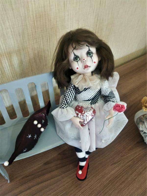 Кукла «Пьеро». Эмоциональный образ Пьеро-девочки…… Особенно впечатляет маленькое красное сердечко, лежащее на коленях у героини.