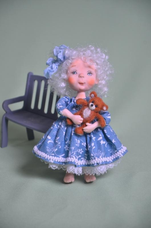 Кукла «Кудряшка». Маленький курносый носик, голубые глаза, белокурые кудряшки на голове, ручки, нежно и заботливо обнимающие любимую игрушку. А как внимательно и точно автор подмечает все необходимые детали изделия!