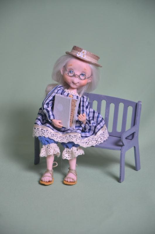 Кукла «Любимая сказка». Это образ девочки, которая любит читать. Книжечка в руках, маленькие очки на курносом носике, шляпка на голове от палящих солнечных лучей и маленькая скамейка в парке, как будто специально предназначенная для любителей чтения.