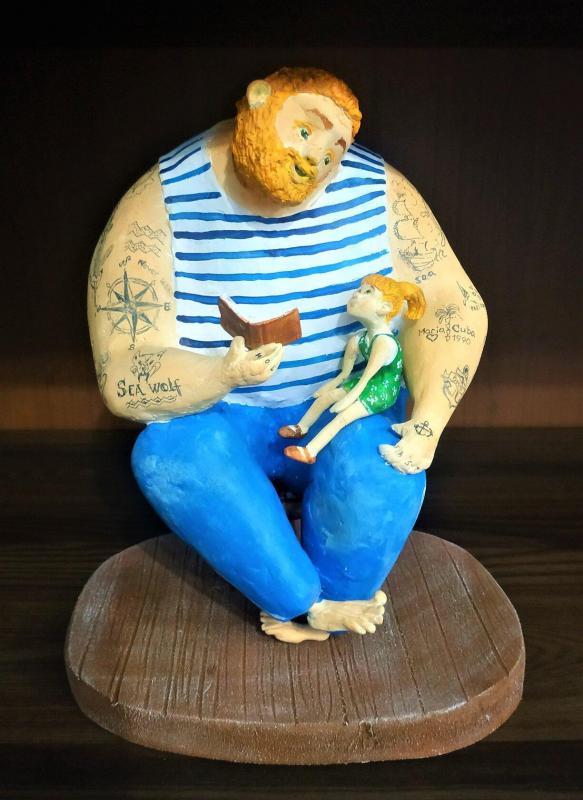Композиция «Мой папа». В данной композиции автор использует интересный прием контрастов в размерах и образов папы и ребенка. Художник осознанно создает контраст и в пропорциях фигуры папы (большое тело и маленькие кисти рук и стоп) и мастерски выражает в фигуре, взгляде, наклоне головы любовь отца к маленькой дочери.
