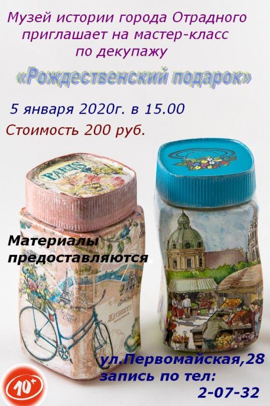 Приглашаем на мастер - класс "Рождественский подарок", который проводтся 5 января в 15 часов в здании музея по ул. Перовмайская, 28.