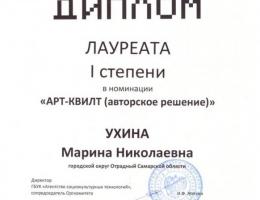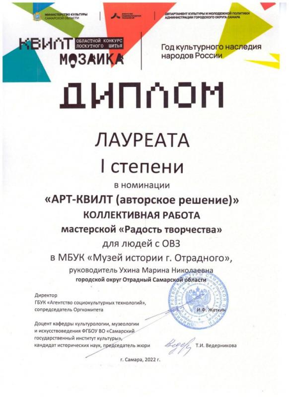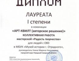 Члены мастерской «Радость творчества» для людей с ограниченными возможностями здоровья, который работает с 2012 года под руководством экскурсовода Ухиной М.Н. при музее истории города Отрадного, решили участвовать в конкурсе со своими декоративными панно. Конкурс проводился в нескольких номинациях»: «Лоскутное панно», мини-квилт «Русский стиль», «Арт-квилт» (авторское решение), «Детское лоскутное одеяло».