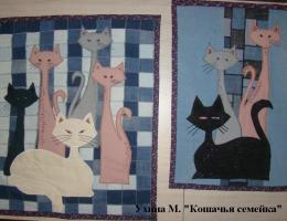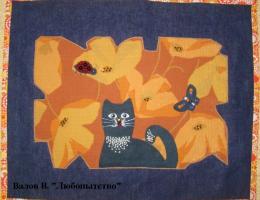 Это было незабываемо, когда для вручения дипломов мы выходили на сцену и очень известные члены жюри поздравляли нас с победой! Ну а получили мы дипломы I степени! Валов Виталий, Сучкова Юлия и Краснощекова София за коллективную работу «Мартовские коты», состоящую из четырех панно. И Ухина Марина Николаевна за парное панно «Кошачья семейка» и триптих «Времена года».