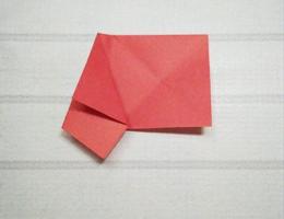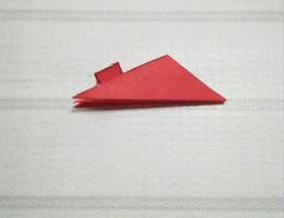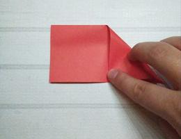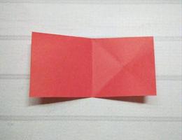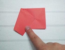 Теперь приступим ко второй части работы – созданию пятиконечной звезды, которой будет украшена наша открытка «Фронтовой треугольник» к 9 мая. Шаблон звезды найти не составит труда, но лучше всего сделать звездочку в технике оригами.Возьмем красный двухсторонний бумажный квадрат. Согнем его пополам и разрежем на два равных широких прямоугольника. Возьмем один из них, сложим пополам, затем развернем. Должен быть хорошо виден сгиб. Подведем к этому сгибу верхний уголок одной из половинок прямоугольника, а затем развернем. Точно также подогнем нижний уголок.Теперь получились две линии сгиба, которые пересекаются в одной точке. Подведем к этой точке верхний уголок ранее не использовавшейся половинки.