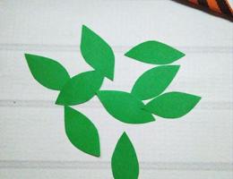 Возвращаемся к нашей открытке. Оборачиваем ее георгиевской ленточкой. Наклеиваем поздравительную надпись на коричневую бумагу. Обрезаем по краям. Наклеиваем надпись на уголок открытки. Берем зеленую бумагу и вырезаем из нее множество одинаковых листиков. В верхний уголок открытки приклеиваем букетик цветов и листики. Затем приклеиваем букетик цветов и листики. Смазываем клеем крепления звезды. Приклеиваем звездочку в центр треугольника, подкладывая снизу зеленые листочки. Открытка готова.