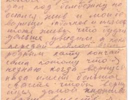 Здравствуйте многоуважаемые Стеша и Витя. Шлю я вам свой фронтовой привет и тысячу наилучших пожеланий. Во-первых строках моего письма я вам сообщаю, что я жив и здоров того и вам желаю. Ответа я от вас не получил на те письма почему это так или же вы не пишите вы больше лишнее письмо написать только на письмо отвечаете и то не на каждое я думаю что вы скорее выберете время написать, чем я, вот так Стеша. Я бы вас просил, пишите чаще пока я жив, а то бы написала и время нашла бы, да не кому будет. А моя жизнь такова даже письма не могу дописать, как может срезать немецкая злодейка пуля, а они визжат над головой каждую минуту и стервятник вьется надо мной и мины рвутся и снаряды рядом со мной, ну а мне все таки хочется сообщить вам, а то и так долго не писал да и вы не пишите. Стеша, вы о том знаете, что мы в нынешнее лето не сидим, а гоним немца со своей земли и освобождаем своих матерей и детей и братьев и сестер, а еще мы проходим населенные пункты и города. Так нас встречают, так рады, так описать не могу, а особенно рады в городах, которые мы освободили. Мы праздновали вместе с народом, они нас встречали и даже дети, и давали подарки, кто что мог, а солдату что надо? Кушать да покурить. Вот и все Стеша, я имею большое счастье в нынешнем году ввиду того, что зелени покушал всякой, даже груш, в общем всего, а для меня это большое дело не как прошлым летом не видали ничего акромя картошки. Передавай привет всем родным и знакомым.