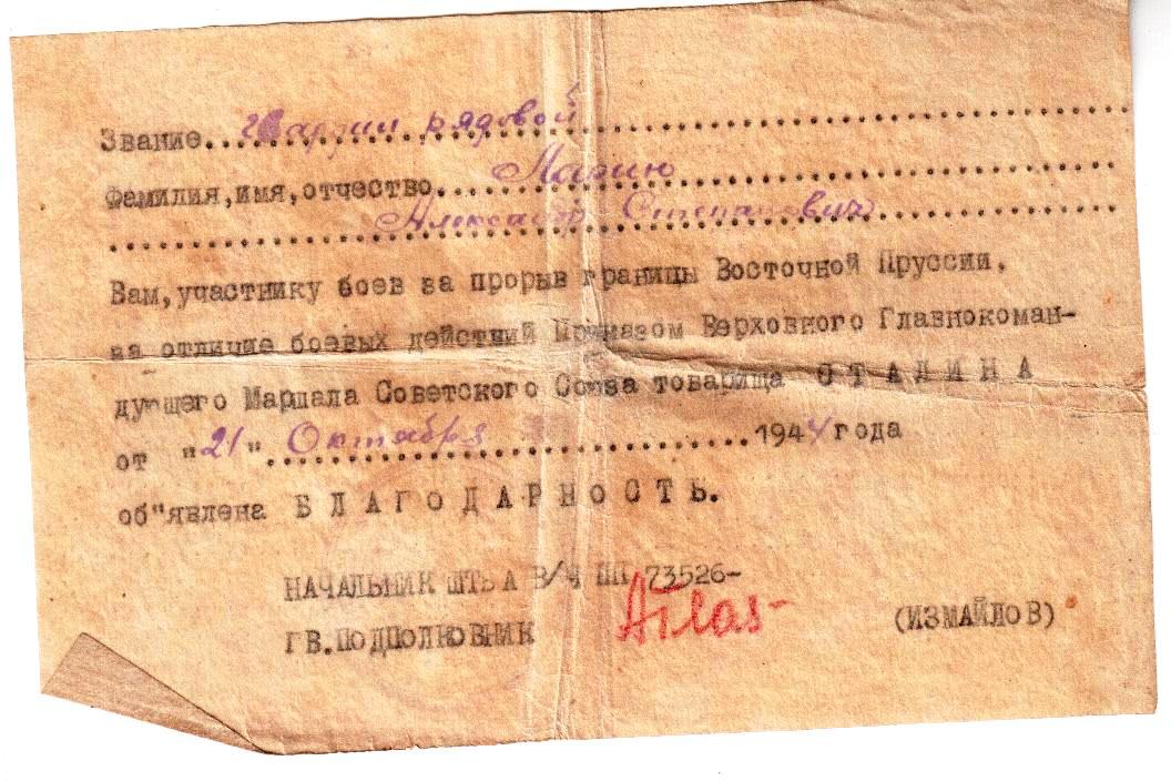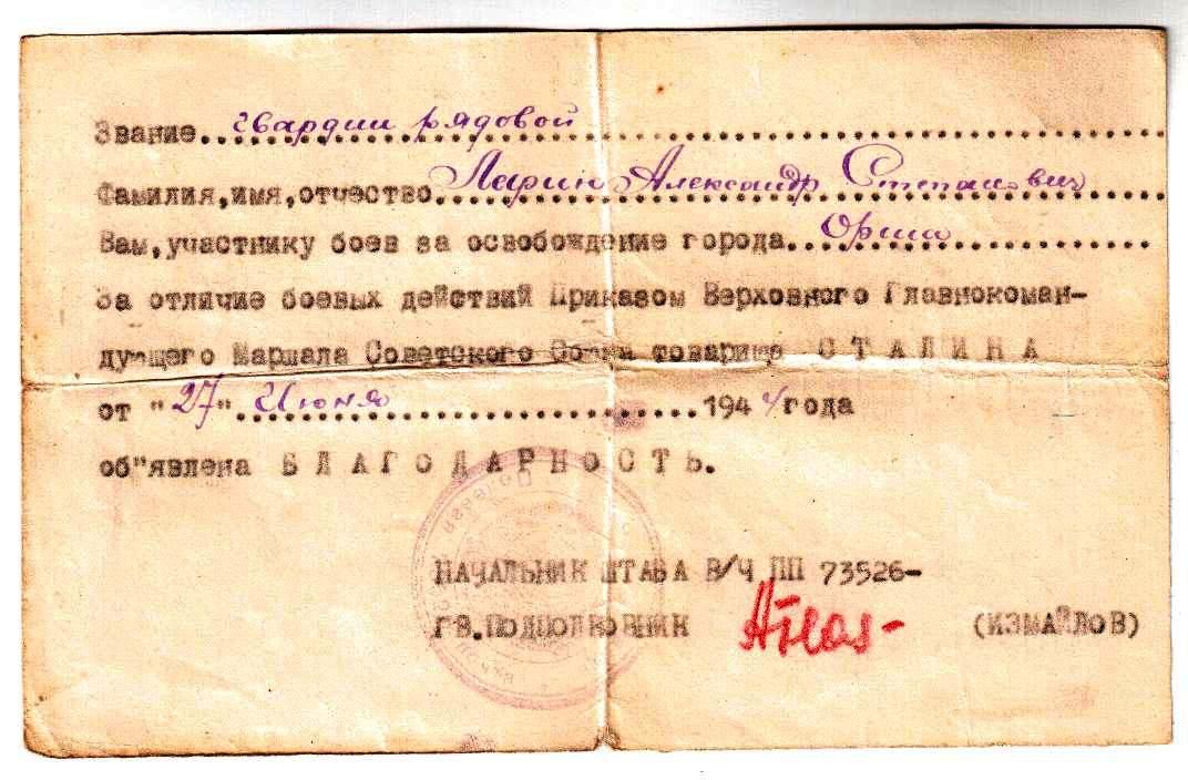 В первое же лето после лечения в госпитале, он опять положил в карман гимнастерки ромашку, сорванную в районе города Вязьмы. Где только не воевал Александр Степанович, но ромашку сумел сохранить. Много военных дорог прошел боец: был на Ладожском озере и защищал Ленинград, воевал под Москвой, с боями прошел через многие города России, Польши, Германии, но та ромашка была всегда с ним. Горели и взрывались машины, на которых подвозил отец снаряды на передовую для танкистов 35-го отдельного гвардейского танкового полка.