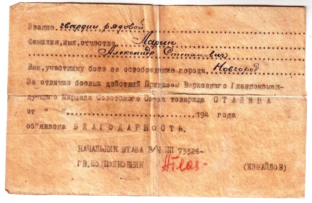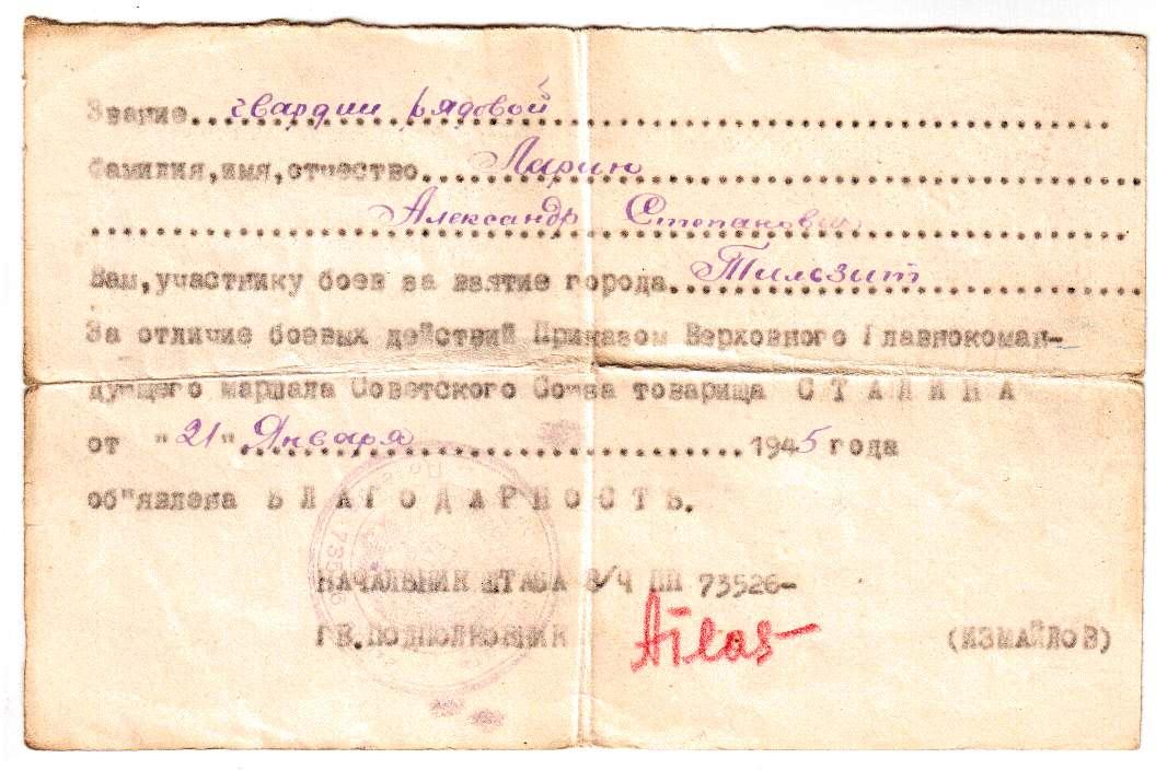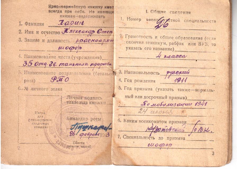 ЛАРИН Александр Степанович родился в 1911 году. Уроженец поселка Жарки Кузоватовского района Ульяновской области.