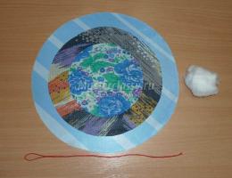 Из квадратных отрезов вырезаем круги диаметром 25, 20 и 15 см. В центре наибольшего круга укладываем эту конструкцию, оборачиваем тканью и стягиваем так, чтобы получилась объемная заготовка головы и юбки. Перевязываем красной нитью. Именно этот цвет обладает большей защитой. Теперь куколка приобрела более достойный вид, у нее появилось личико.