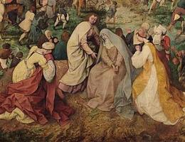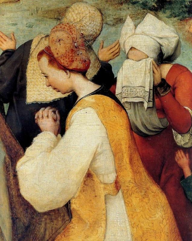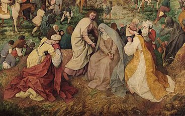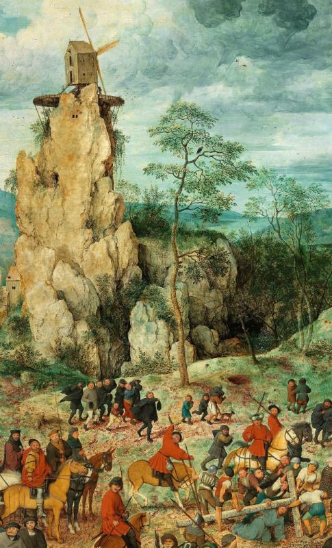 Итак, в первый момент мы не фиксируем взглядом Христа, но видим рассеянные по широкой долине толпы людей. Пешие в черных, коричневых и серых одеждах выглядят как современные Брейгелю нидерландские мещане и крестьяне.