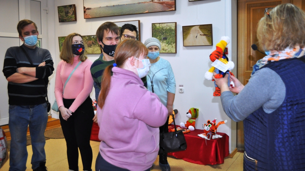 Путешествие по музею продолжилось уже в другом выставочном зале, где представлены замечательные поделки и сувениры на выставке творческих работ «А у нас Новый год!». Юные жители города из детских садов и школ города вместе с родителями изготовили на новогоднюю выставку маскарадные маски, поздравительные открытки. Очень понраивлись экскурсантам символы нового года: тигры, елочки, елочные игрушки, сувениры и новогодние композиции..
