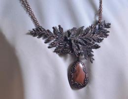Гривна «Вересковый мед» и кулон «Вересковый мед». Гривна выполнена в технике гальваники, с обжигом, патинированием и шлифовкой. Состоит из трех частей, соединенных между собой бусинами. Материалы гривны: омедненные фрагменты бумаги для цветочных букетов, кабошон и бусины авантюрина, металлическая фурнитура. Название необычное. Авантюрин напоминает капли меда, а вереск - это символ бессмертия и молодости. Все понятия красиво объединились в названии «Вересковый мед».
