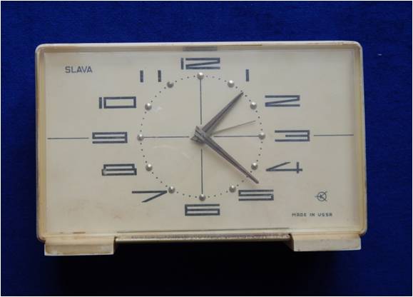 Корпус часов прямоугольный, пластмассовый, цвета слоновой кости. Циферблат плоский, пластмассовый, желтого цвета с полной арабской оцифровкой. Цифры, минутная шкала и надписи "SLAVA", "MADE IN USSR" выполнены краской черного цвета. Стрелки плоские, латунные, с полосой черного цвета. На верхней грани корпуса имеется кнопка отключения сигнала будильника.