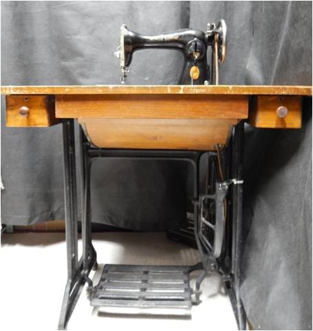 Изготовитель: Подольский механический завод им. Калинина (ПМЗ). Время создания: вторая половина XX века. Материал: металл, дерево. Швейная машинка из металла, черного цвета, приводится в действие с помощью ремня и педали, которая находится внизу стола. На крышке стола внизу по левому и правому краю сделаны ячейки для хранения, ящички выдвигаются. Машинка складывается в стол и закрывается при помощи двух дверок.