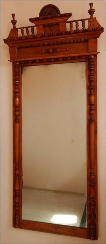 Основной мотив резьбы - геометрический. По краям фронтона находятся точеные балясины, имитирующие форму вазона. Навершие фронтона – полукруглое. Рама зеркала окрашена в тёмно – коричневый цвет. Зеркала и зеркальные комнаты во все времена завораживали людей.