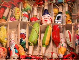 В конце 50-х годов появляются гирлянды из лампочек-фигурок: внутри фигурки из толстого стекла закреплялась нить накаливания, а сама фигурка вставлялась в цоколь, который был закреплен на проводе.