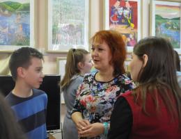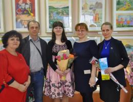 С большим событием в творческой жизни поздравили художницу начальник отдела культуры Е.С.Титова, классный руководитель школы №6 Е.Н.Калугина, директор музея Г.Т.Гурьянова, мама Е.В. Зыбанова.