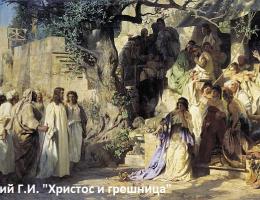 И снова произведение Генриха Ипполитовича Семирадского «Христос и грешница (Кто из вас без греха?)» (1886-1887 гг., Государственный Русский музей, Санкт-Петербург). Евангелие от Иоанна 8:3-11: «Тут книжники и фарисеи привели к Нему женщину, взятую в прелюбодеянии, и, поставив ее посреди, сказали Ему: Учитель! эта женщина взята в прелюбодеянии; а Моисей в законе заповедал нам побивать таких камнями: Ты что скажешь? Говорили же это, искушая Его, чтобы найти что-нибудь к обвинению Его. Но Иисус, наклонившись низко, писал перстом на земле, не обращая на них внимания. Когда же продолжали спрашивать Его, Он, восклонившись, сказал им: кто из вас без греха, первый брось на нее камень. И опять, наклонившись низко, писал на земле. Они же, услышав [то] и будучи обличаемы совестью, стали уходить один за другим, начиная от старших до последних; и остался один Иисус и женщина, стоящая посреди. Иисус, восклонившись и не видя никого, кроме женщины, сказал ей: женщина! где твои обвинители? никто не осудил тебя? Она отвечала: никто, Господи. Иисус сказал ей: и Я не осуждаю тебя; иди и впредь не греши».