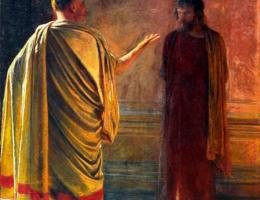 Еще одно произведение Николай Николаевич Ге - «Что есть истина» (1890 г., Государственная Третьяковская галерея, Москва). В 1889 году Николай Ге задумал картину «Что есть истина? Христос и Пилат», представляющую собой живописную версию 18-й главы Евангелия от Иоанна. Иисус и Пилат написаны Ге с непривычной для конца XIX века остротой. Пилат с его выразительным, мощным затылком и широкой спиной показан властным римлянином, самоуверенным сибаритом. Он обращает свой вопрос к обвиняемому без ярости или злобы, с высокомерной насмешкой. Пилата вряд ли интересует ответ на его вопрос «Что есть истина?» – он уверен, что знает его и сам. Между ним и Христом пролегает луч света, разделяющий их, подобно мечу; это напоминает о других словах Христа: «Не мир пришёл Я принести, но меч»(Мф. 10:34).