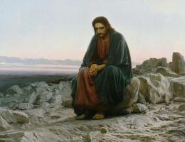 Иван Николаевич Крамской (1837-1887), мастер портретного жанра, написал «Христос в пустыне». (1872 г., Государственная Третьяковская галерея, Москва).В картине Крамского пустыня производит впечатление холодного ледянящего пространства, в котором нет и не может быть жизни. Могучая вертикаль словно окаменевшей от дум фигуры Христа противостоит бесконечной шири пустыни. В его лице, особенно во взгляде, полном напряженной мысли, читается некая отрешенность, отсутствие реальности здешнего мира. Он изображен спиной к розовеющему горизонту, он может только угадывать восход. Утро возрождения наступило, но солнце еще не встало...
