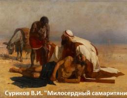 Знаменитый Василий Иванович Суриков (1848 -1916) работал над несколькими библейскими сюжетами. Один из них - «Милосердный самаритянин» (1874 г., Красноярск, Художественный музей имени В.И. Сурикова).