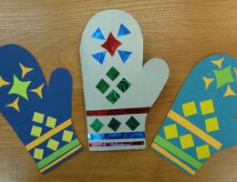 В конце программы мы предлагаем нашим посетителям из цветного картона с помощью шаблона, ножниц и клея создать свою рукавичку-открытку, которая всегда пригодится в зимние праздники для поздравления друзей и знакомых.
