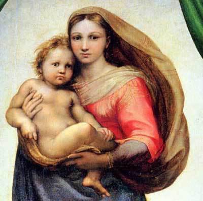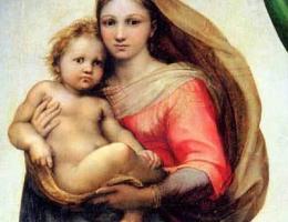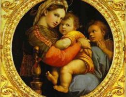 «Сикстинская Мадонна» - пожалуй, самый трагический образ Богородицы из созданных Рафаэлем. Лицо Пречистой Матери выражает не только сильнейшую любовь к Сыну, но и - что самое важное в этом образе - решительное и в то же время смиренное принятие воли Бога-Отца, который дал ей Младенца, дабы она, вырастив Его, отдала на заклание.