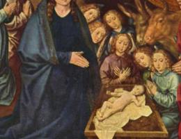 Образ мадонны разнообразно раскрывается во многих полотнах художников эпохи Возрождения. В середине и во второй половине XV века в работах Нидерландских художников особенной прелестью обладают композиции, проникнутые кротким, созерцательным настроением. Они прибегают к сюжетам рождества и поклонения младенцу, эти сюжеты решаются ими тонко и простодушно. В «Поклонении пастухов» Гуго ван дер Гуса (фото 4,5), младенец очень худенький, как всякое новорожденное дитя, окружающие смотрят на него, беспомощного и скрюченного, с глубоким душевным умилением, мадонна тиха, не подымает взора, но чувствуется, что она полна скромной гордостью материнства. А за пределами яслей виднеется пейзаж Нидерландов, широкий, холмистый, с извилистыми дорогами, редкими деревьями, башнями, мостами.