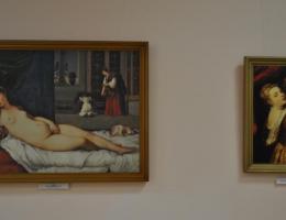 В многообразной панораме выставки нелегко выделить отдельные примеры, и все же репродукция картины Тициана «Венера Урбинская» достойна этого по праву. Картина написана по заказу герцога Урбинского. Возможно прототипом Венеры Урбинской послужила юная невеста Гвидобальдо. По другой версии моделью для картины послужила возлюбленная Тициана, высказывалось также предположение, что на картине могла быть изображена мать Гвидобальдо (источник https://ru.wikipedia.org/wiki/Тициан).