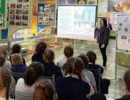 Особое место в сердцах юных слушателей заняла трагическая история японской девочки Садако Сасаки. Ее история, рассказанная с помощью видеопрезентации, напомнила, что скорбь по павшим объединяет народы. С помощью слайд – презентации ребята увидели, как в разных уголках России и мира воздвигнуты памятники, где журавли стали символом вечной памяти и скорби о тех, кто не вернулся домой.