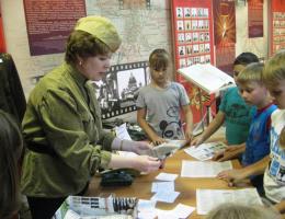 Экскурсовод: Разведчики, равняйсь, смирно! Поздравляю вас с 75-летием Великой Победы и окончанием «Школы разведчиков». Подсчитываются трофеи и подводятся итоги игры. На память об участии в программе юным разведчикам вручаются эмблемы "Школы разведчиков".