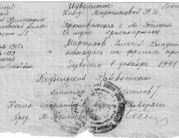 Он погиб 12 октября 1943 года, попал под бомбежку, его ранило осколком в грудь, погиб сразу. Похоронен в лесу в братской могиле. Могилу ему сделали как хорошему воину Красной армии. Я сам был на передовой. Держу трубку около уха и очень волнуюсь. И тут мне сообщают, что твой боец Скрябнев убит. Так у меня сразу трубка выпала из рук. Стоящие около меня думали, что со мной случилось. Я всю ночь не спал, все думал о нем. Ну на этом я свое письмо заканчиваю писать и думаю, что вы мне напишете ответ.
