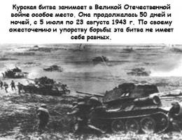 Сражение на Курской дуге, проходившее с 5 июля по 23 августа 1943 года, по своим масштабам, задействованным силам и средствам, а также по результатам и военно-политическим последствиям является одной из ключевых битв Второй мировой и Великой Отечественной войн. Сражение на Курской дуге продолжалась 50 дней. По результатам этой операции стратегическая инициатива окончательно перешла на сторону Красной армии и до окончания войны проводилась в основном в виде наступательных действий с ее стороны.