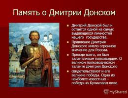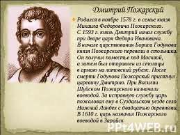 Дмитрий I Иванович - князь Московский и великий князь Владимирский, прозванный Донским за победу в Куликовской битве в 1380 году над полчищами татаро-монгольского хана Мамая. На битву получил благословение Сергия Радонежского. Памятник Дмитрию Донскому установлен в городе Коломне рядом с кремлём. В честь него назван один из Московских монастырей. В 1612 году в Смутное время, когда на Руси не было царя, этим воспользовались враги. Польско - литовские войска захватили Московский Кремль и посадили на трон своего короля Сигизмунда.
