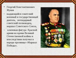 Константин Георгиевич Жуков - советский военачальник, маршал Советского Союза министр обороны СССР, четырежды Герой Советского Союза, кавалер двух орденов «Победа» и множество других орденов и медалей. Под его командованием во время Великой Отечественной войны советские войска одержали победу во всех главных сражениях. В настоящее время в армии учреждена медаль имени Жукова за мужество и героизм.
