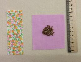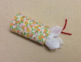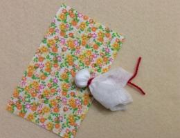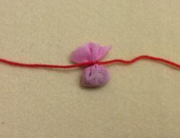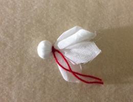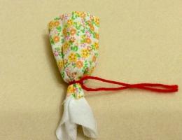Для этого нужно взять квадрат ткани размером примерно 8* 8см. В центр ткани насыпать немного любой крупы. Поднимаем длинные края ткани, затем подминаем пальчиками серединки квадрата, формируем узелок и завязываем красной нитью. Концы нитки не обрезаем, они еще нам понадобятся. Можно оставить узелок без изменения, а можно аккуратно подрезать лишние нитки.