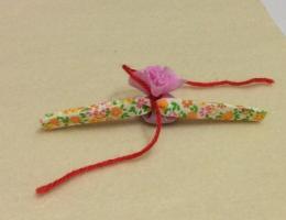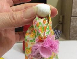 Для их изготовления берем небольшой кусочек ткани в цвет платья, или любой другой расцветки. Размер может быть 12 * 5 см. Складываем ткань пополам вдоль лицевой стороной наружу, заминаем место сгиба. Раскрываем ткань и снова еще раз или два подворачиваем ткань внутрь. Делаем своего рода рулик. Заминаем ткань, чтобы этот рулик держал нужную форму. Привязываем сохраненной ниткой узелок к середине нашего рулика. И только, когда вы видите, что все узлы крепкие и узелок хорошо держится, тогда обрезаем нитку. Сгибаем ручки пополам. Внизу у нас привязан узелок, концы ручек приставляем к шее куклы таким образом, чтобы узелок находился внизу. Соблюдаем пропорции. Привязываем ручки одной ниткой к шее куклы.