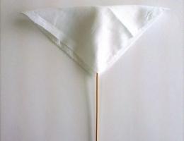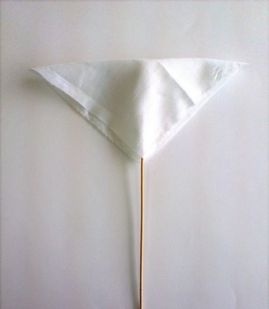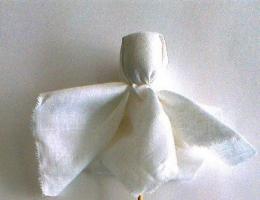 2. Квадрат белой ткани складываем по диагонали, в середину вкладываем палочку.