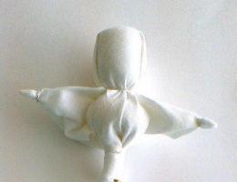 3. Формируем голову, закладываем мелкие складочки по бокам, чтобы лицо было гладкое без морщинок. Обматываем ниткой вокруг шеи, завязываем на два узелка, концы ниток обрезаем.