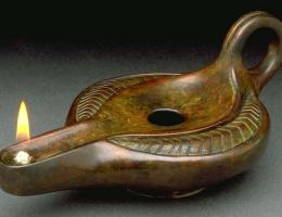 Сначала появилась масляная лампа (фото 2). Это светильник, работающий на основе сгорания масла. Масляная лампа применялась ещё с эпохи палеолита. В древние времена масляные лампы делали из камня, глины, или изготовляли из меди и других металлов. В арабской сказке «Аладдин» из сборника «Тысяча и одна ночь» в медной лампе обитает заточённый туда Джинн (сказка «Алладин»).
